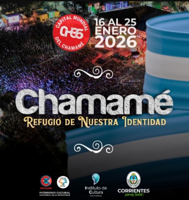 La Fiesta Nacional del Chamamé 2026, que tendrá lugar del 16 al 25 de enero en el Anfiteatro Mario del Tránsito Cocomarola de Corrientes. Se presenta bajo el lema “Chamamé, refugio de nuestra identidad” y durante diez noches, el festival reunirá a destacados músicos, bailarines, agrupaciones tradicionales y delegaciones del MERCOSUR.
