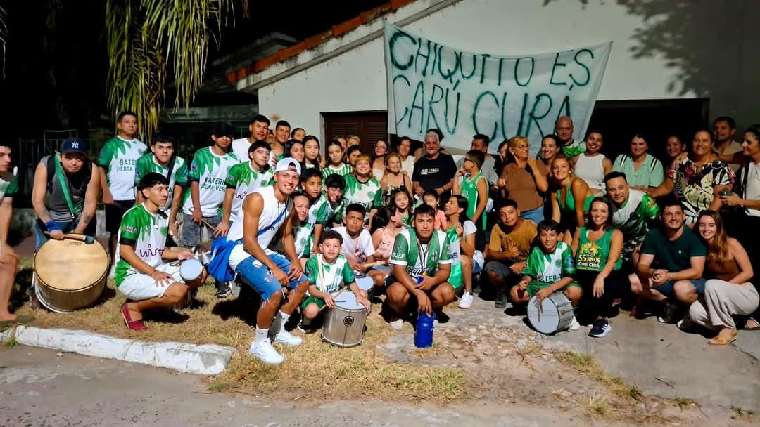 María José Iglesia Reina de Oro Caru Curá 50 años comentó a Comunicándonos que un grupo de comparceros , integrantes de escuela de samba , jefas de grupos , simpatizantes en general de la piedra verde se concentraron en la plaza Constitución y de allí marcharon hacia el domicilio particular del locutor que queda a unos 80 metros del lugar , cuando estuvieron frente a la casa gritaron Chiquito queremos que estés en la última noche animando a la comparsa , el locutor histórico de la abrió las puertas de su domicilio y salió a recibirlo , les agradeció el profundo apoyo , quedó hablando con cada uno de ellos , luego de la manifestación se desconcentraron .