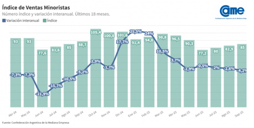 El informe mensual de la Confederación Argentina de la Mediana Empresa (CAME), que nuclea la mayoría de los comercios y empresas pequeñas y medianas, fue negativo. Septiembre cerró con un retroceso generalizado en las ventas minoristas pymes, reflejando la fragilidad del consumo interno y el impacto de la incertidumbre económica y política.