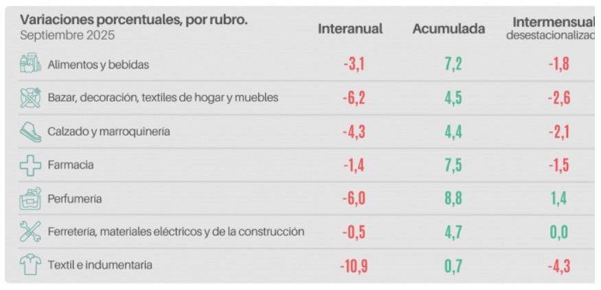 En el análisis por rubros, la situación fue homogénea, con caídas interanuales en todos los sectores. Los más afectados fueron Textil e indumentaria (-10,9%) y Bazar, decoración, textiles para el hogar y muebles (-6,2%). En la comparación intermensual, la tendencia fue similar, salvo en Perfumería, que registró un crecimiento del 1,4% respecto del mes anterior, y en Ferretería, materiales eléctricos y de la construcción, que mantuvo los mismos niveles de ventas.
